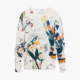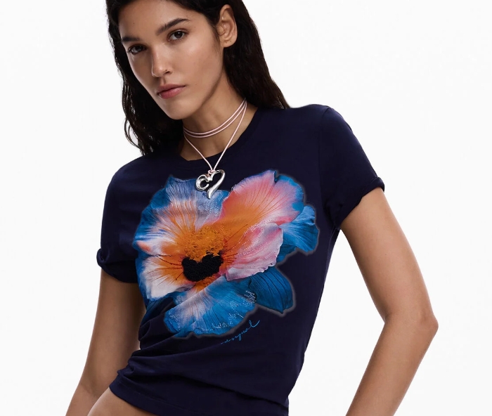 Figurbetontes T-Shirt mit Rundhalsausschnitt und kurzen Ärmeln mit großem Blumenprint auf der Vorderseite.