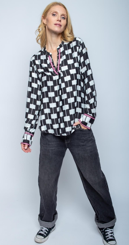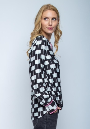 Süße Shirtbluse mit lässiger Passform und Stehkragen, der freche geometrische Print in weiß/schwarz und rosa, sowie die Kontrast-Bordüre ziehen alle Blicke auf die Trägerin