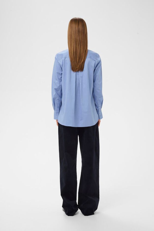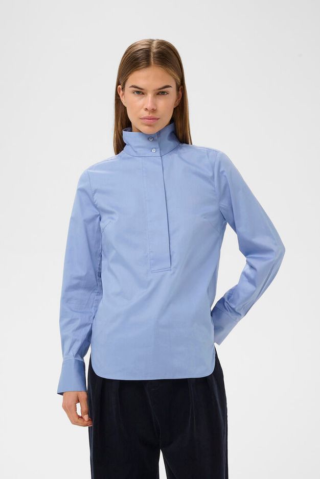 Diese Damenbluse bietet einen legeren Schnitt, hohen Stehkragen und verdeckte Knopfleiste. Lange Ärmel mit breiten Manschetten sorgen für ein elegantes Erscheinungsbild und hohen Tragekomfort.