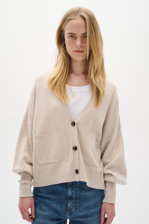Damen Strickjacke mit lockerer Passform, V-Ausschnitt, Knopfleiste, überschnittener Schulter, kurzem Schnitt und weiten Ärmeln. Vielseitig kombinierbar.