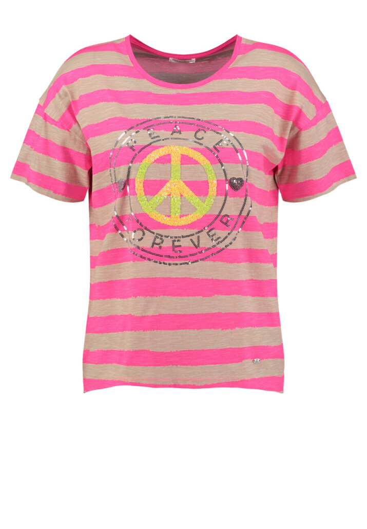 Die dünnen Blockstreifen wirken sommerlich und leicht, während das große Peace-Symbol