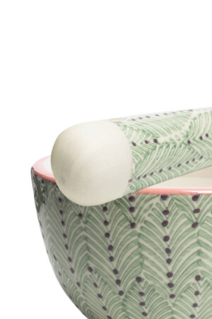 Frische Muster in der Küche gibt es bei diesem Set aus handgestempeltem Steinzeug. Der Mörser mit passendem handgemachtem Stößel hilft dir beim Mahlen und Zubereiten von Pestos, Gewürzen und Nüssen. Seinen handgemachten Charme sieht man dem Stößel auch an.