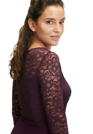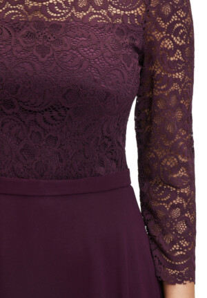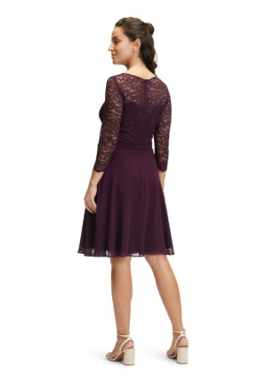 Wunderschönes Cocktailkleid in auberginem Chiffon kombiniert mit weicher hochwertiger Spitze.